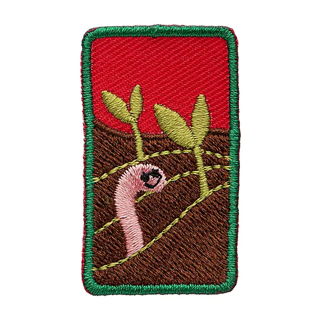 Stingene er brodert på en stoffbit slik at merket får et fin og taktil struktur. Den broderte kanten gjør at merket er lett å sy fast på speiderskjorte, leirbålskappe eller sekk.