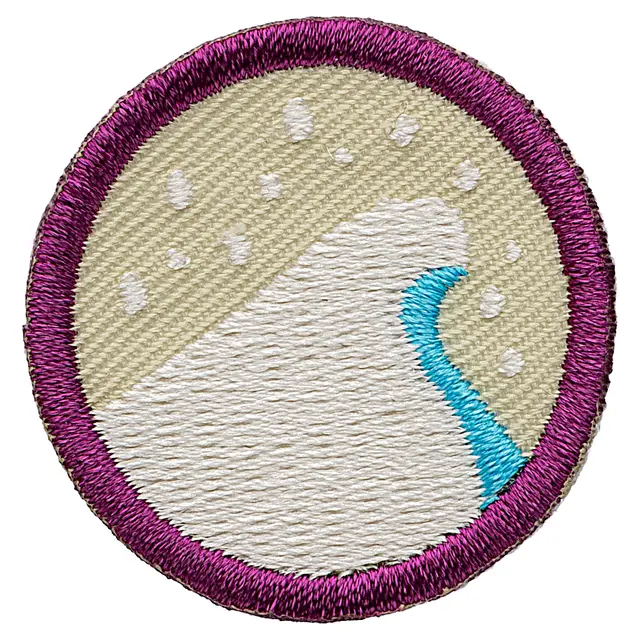 Stingene er brodert på en stoffbit slik at merket får et fin og taktil struktur. Den broderte kanten gjør at merket er lett å sy fast på speiderskjorte, leirbålskappe eller sekk.