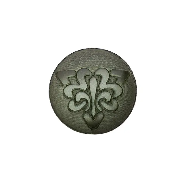 KFUK-KFUM-speidernes Reserveknapp i tykk plast med stilk til eldre speiderskjorter produsert før 2013.