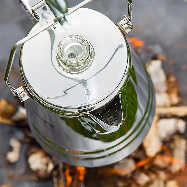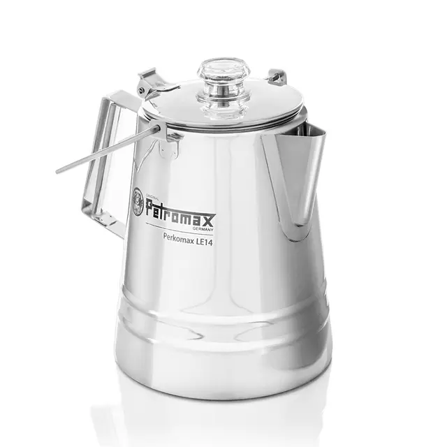 Petromax Percolator Perkomax 14 er en robust kaffekjele i rustfritt stål som rommer åtte kopper kaffe. Kannen er designet for å henge over bålet og er perfekt til brygging av turkaffe. Plastknotten på lokket lar deg følge med på kokingen uten å ta av lokket.