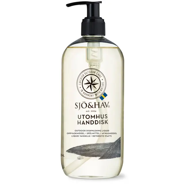 Sjö&Hav Utomhus Handdiskmedel er et mildt håndoppvaskmiddel tilpasset saltvann utviklet for deg som vasker opp utendørs men samtidig ønsker å belaste et sensitivt miljø minimalt. Renser og løser opp fett effektivt selv i kaldt saltvann og ferskvann med et skinnende resultat. Ikke overdoser. 2 cl er nok til ca fem liter vann. Vaskemidlet er vegansk og biologisk nedbrytbart, men for minst mulig påvirkning, filtrer brukt vann gjennom jord eller unngå å bruke det direkte i stillestående vann. Parfymefri.