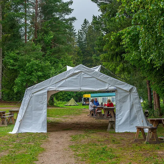 Teltet har fire vinduer og inngang i begge ender. Inngangene kan rulles opp eller tas av. Sideveggene kan delvis rulles opp eller tas av. Luke for skorstein. Vaskbar og flammesikker polyesterduk. Kraftig stangsett i aluminium (40x2 mm aluminiumlegering). Hurtigkoplinger i støpt aluminium.